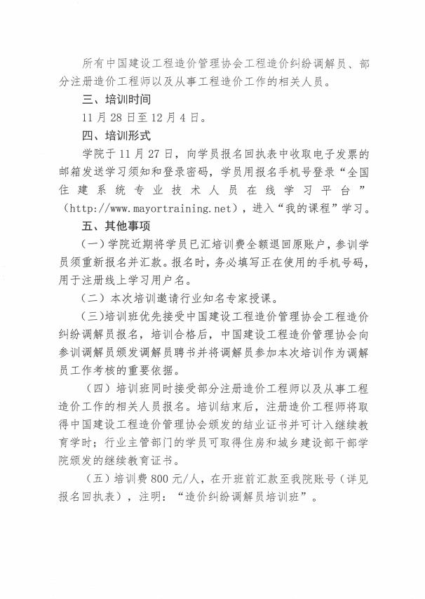 住建部干部学院和中价协联合举办线上工程造价纠纷调解员培训班