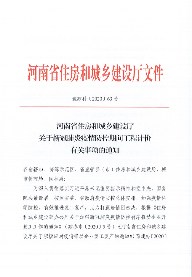 [河南省]河南省住房和城乡建设厅关于新冠肺炎疫情防控期间工程计价有关事项的通知