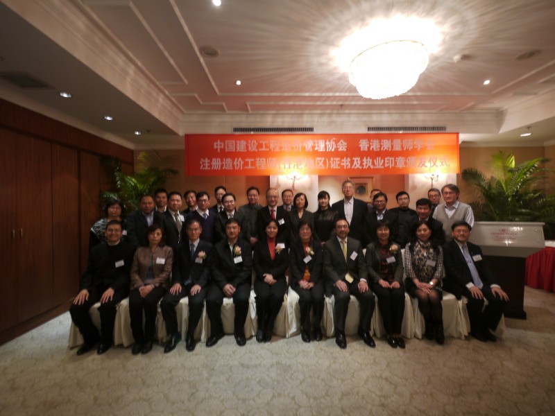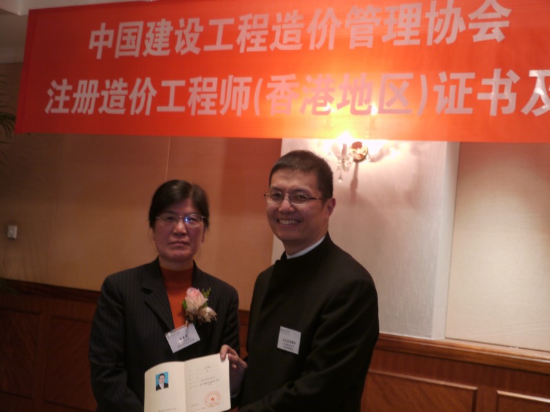 2012年12月12日应香港测量师学会的邀请,住房和城乡建设部标准定额司徐惠琴司长、谭华处长及中国建设工程造价管理协会吴佐民秘书长等一行四人出席了在深圳举办的颁证仪式,为2012年经住房和城乡建设部批准合格的65名香港测量师学会会员颁发内地造价工程师注册证书。颁证仪式上,徐惠琴司长、吴佐民秘书及香港测量师学会何韻诗会长分别致词,并对取得内地执业资格批准合格的香港测量师学会会员表示祝贺。同时,希望他们在今后的工作中能够发挥其香港专业人才的优势,利用自身的专业水平和国际化管理理念,为内地的工程建设领域和造价咨询行业的健康发展发挥积极的作用。